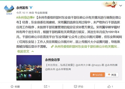 昨日,永州市委組織部通報事件調(diào)查結果稱,經(jīng)查,東安縣委在周建明、宋雨翼的選拔任用過程中,未嚴格執(zhí)行干部選拔任用工作程序,未按照干部雙重管理的規(guī)定征求協(xié)管方意見。其中,宋雨翼早期學籍材料有兩個出生年月,根據(jù)干部檔案有關政策進行核實,其出生年月應為1991年4月。此外,關于此前公示圖片不清晰的問題,調(diào)查結果稱,干部任前公示在首發(fā)平臺“東安黨建”公眾號上的公示圖片清晰,但東安新聞網(wǎng)(紅網(wǎng)東安站)工作人員在轉(zhuǎn)載公示圖片時,因上傳圖片大小設置問題,導致原圖被壓縮后顯示不清晰。