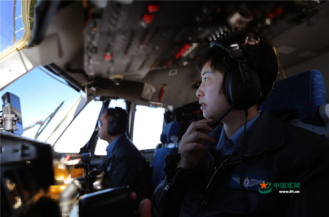空軍首位運-9飛機女機長陳金蘭駕駛飛機飛赴目標空域。劉暢 攝影