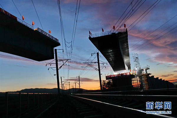 河北省懷來縣境內(nèi)的新建京張高鐵跨大秦鐵路線土木特大橋連續(xù)梁在轉(zhuǎn)體中(9月17日攝)。新華社記者 楊世堯 攝