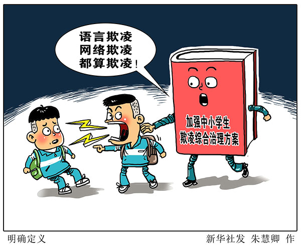教育部教育督導局局長、國務院教育督導委員會辦公室主任何秀超介紹,在11部門聯合印發(fā)的方案中,首次對學生欺凌作出明確界定,指出中小學生欺凌是發(fā)生在校園內外、學生之間,一方單次或多次蓄意或惡意通過肢體、語言及網絡等手段實施欺負、侮辱,造成另一方身體傷害、財產損失或精神損害等的事件。