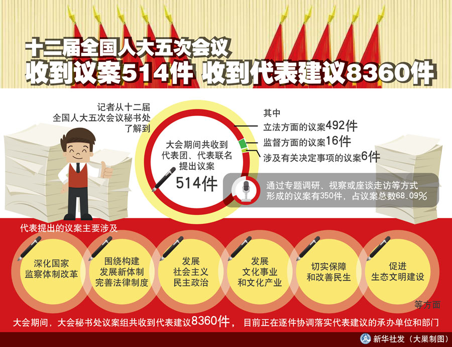 圖表:十二屆全國人大五次會議收到議案514件 收到代表建議8360件 新華社發(fā) 大巢制圖