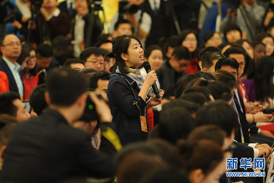 3月15日上午,國務(wù)院總理李克強在人民大會堂三樓金色大廳會見采訪十二屆全國人大五次會議的中外記者并回答記者提出的問題。圖為財新網(wǎng)、財新周刊記者提問。新華網(wǎng)/中國政府網(wǎng) 翟子赫 攝?