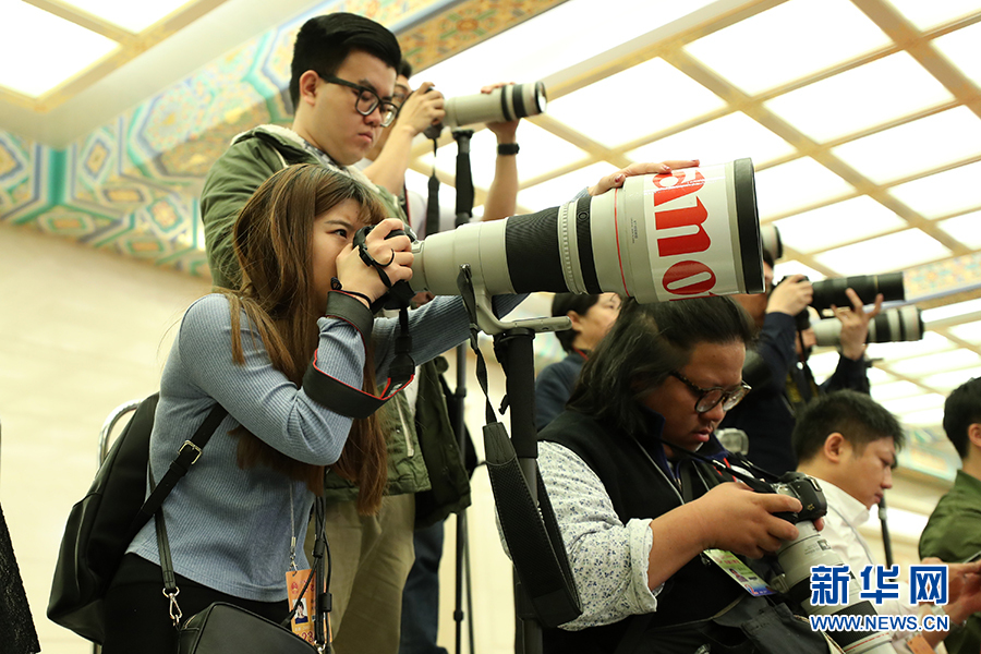 3月15日上午,國務院總理李克強在人民大會堂三樓金色大廳會見采訪十二屆全國人大五次會議的中外記者并回答記者提出的問題。圖為記者會現(xiàn)場的攝影記者。新華網(wǎng)/中國政府網(wǎng) 翟子赫 攝?