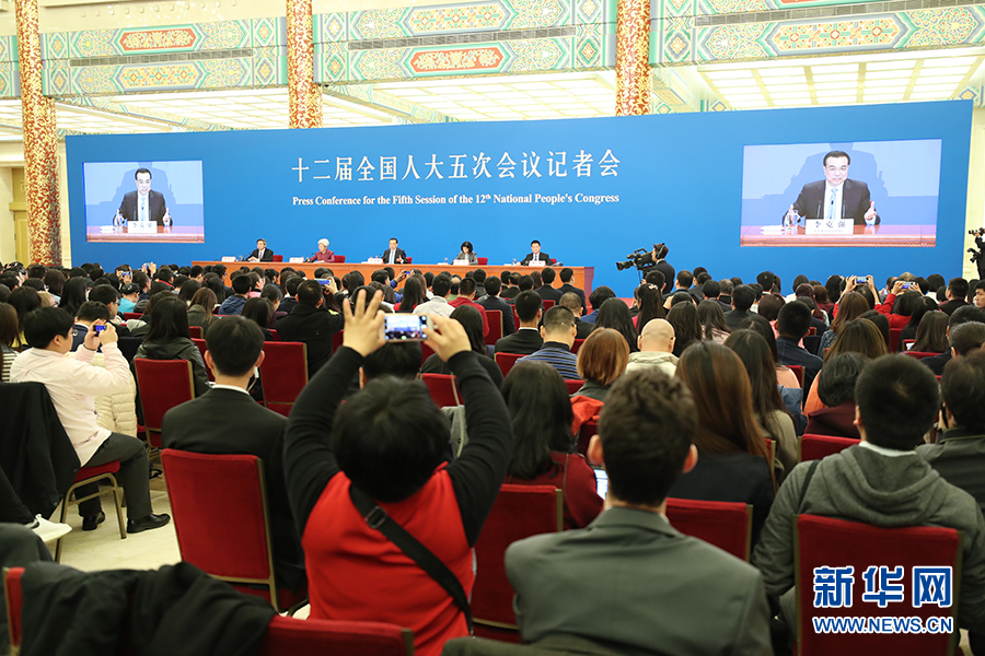 3月15日上午,國務(wù)院總理李克強在人民大會堂三樓金色大廳會見采訪十二屆全國人大五次會議的中外記者并回答記者提出的問題。圖為記者會正在進行。新華網(wǎng)/中國政府網(wǎng) 翟子赫 攝?