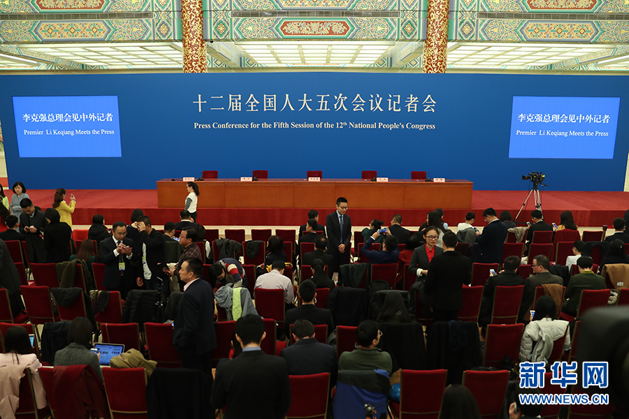 3月15日上午,國務院總理李克強在人民大會堂三樓金色大廳會見采訪十二屆全國人大五次會議的中外記者并回答記者提出的問題。圖為記者會現(xiàn)場。新華網(wǎng)/中國政府網(wǎng) 翟子赫 攝?