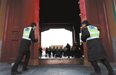 昨日,故宮,保安在進(jìn)行2017年最后一天的晚清場封門。新京報(bào)記者 浦峰 攝