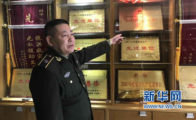 邵陽市礦山救護(hù)支隊(duì)隊(duì)長王建華向記者介紹該隊(duì)獲得的各項(xiàng)榮譽(yù)。新華網(wǎng)于子茹攝