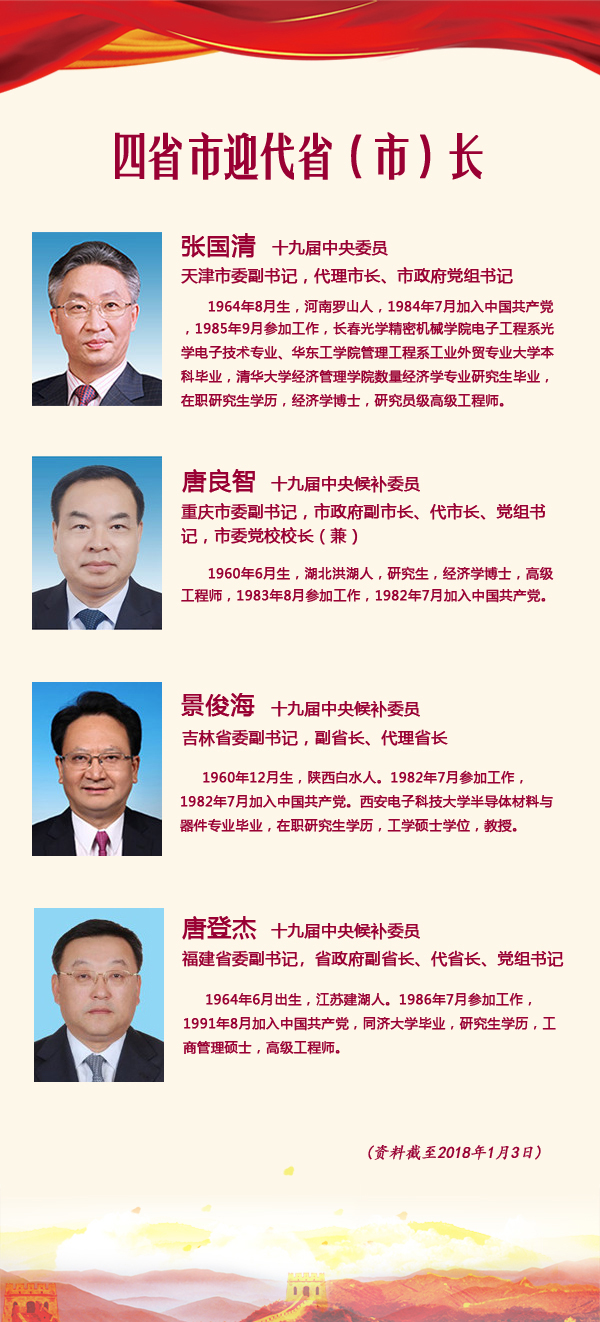 1月2日,天津、重慶、吉林、福建四省市調(diào)整政府“一把手”。其中,重慶市委副書記、市長張國清調(diào)任天津市委副書記、代市長;重慶市委副書記唐良智擔(dān)任重慶市代市長;北京市委副書記景俊海調(diào)任吉林省委副書記、代省長;工信部副部長、國家航天局局長唐登杰出任福建省委副書記、代省長。