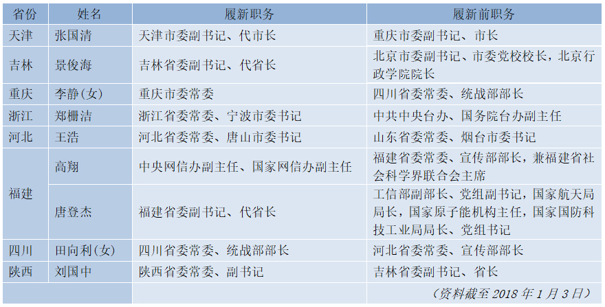 新華網(wǎng)北京1月4日電(記者李志強(qiáng) 陳淑君)歲末年初,重要人事任免不斷。天津、重慶、吉林、福建四省市同日調(diào)整政府“一把手”,上海、河北、北京等地“戎裝常委”陸續(xù)回歸,20余省區(qū)市黨委常委班子成員發(fā)生變動(dòng)。