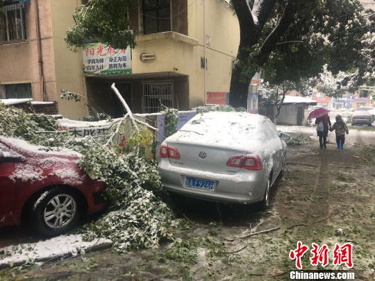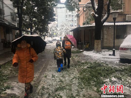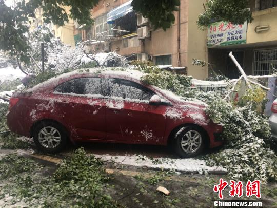 合肥一小區(qū)內(nèi),樹(shù)枝被積雪壓斷砸在路邊??康能?chē)輛上?!≮w強(qiáng) 攝