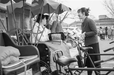 近日,王雪宜等5名年輕車夫成了什剎海景區(qū)的名人,他們中有畫家、雕塑師、戶外從業(yè)者。作為一名女“海歸”,1985年出生的王雪宜在眾多車夫中格外引人注目。
