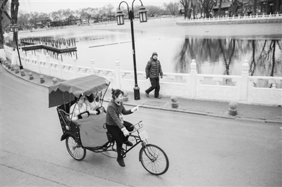 1月4日,北京什剎海景區(qū),車隊為每一個游客都準(zhǔn)備了毯子御寒。圖為王雪宜為兩名年輕游客鋪完毯子后交流今天的行程路線。