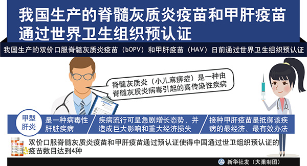 圖表:我國(guó)生產(chǎn)的脊髓灰質(zhì)炎疫苗和甲肝疫苗通過(guò)世界衛(wèi)生組織預(yù)認(rèn)證 新華社發(fā) 大巢制圖