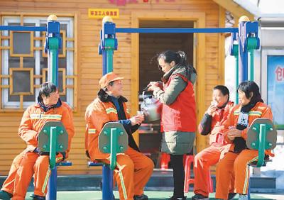 圖為一月十日,安徽省肥西縣環(huán)衛(wèi)工人在“愛心小屋”前喝熱水、曬太陽。新華社記者 劉軍喜攝