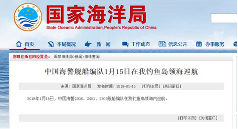 據(jù)國家海洋局網(wǎng)站消息,2017年12月30日,中國海警2306、2502、2106艦船編隊在中國釣魚島領海內(nèi)巡航。2017-12-30 10:09:23