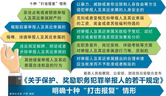 “舉報(bào)人的舉報(bào)行為可能會使違法者面臨較大數(shù)額的罰金甚至刑事處罰,因此,被舉報(bào)者可能會對舉報(bào)人及其家人進(jìn)行或明或暗的報(bào)復(fù)。”杜立元說。內(nèi)部舉報(bào)人往往是企事業(yè)單位職工、公務(wù)員等,如果保護(hù)機(jī)制不健全,就可能遭遇調(diào)換崗位等隱性報(bào)復(fù)行為。舉報(bào)人如何尋找申訴部門、如何對遭到打擊報(bào)復(fù)的舉報(bào)人進(jìn)行救濟(jì)等,都是亟需解決的問題。