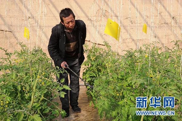 1月19日,甘肅省永靖縣三塬鎮(zhèn)下塬村村民噴灑生物農(nóng)藥,照料日光溫室里的農(nóng)作物。新華社發(fā)(王銘禹 攝)