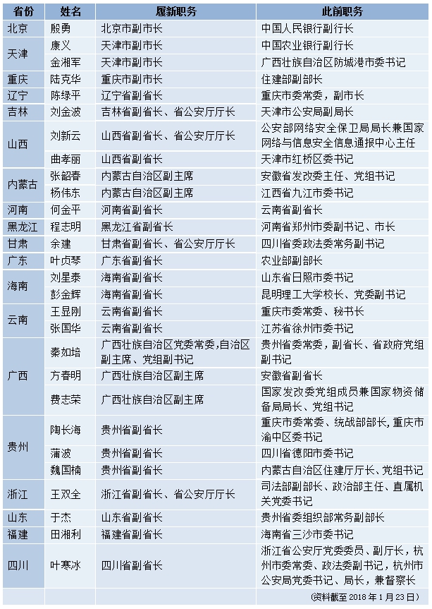 多人來自國(guó)家部委。住建部副部長(zhǎng)陸克華調(diào)任重慶市副市長(zhǎng),農(nóng)業(yè)部副部長(zhǎng)葉貞琴調(diào)任廣東省副省長(zhǎng),國(guó)家發(fā)改委黨組成員兼國(guó)家物資儲(chǔ)備局局長(zhǎng)費(fèi)志榮調(diào)任廣西壯族自治區(qū)副主席,司法部副部長(zhǎng)、政治部主任王雙全調(diào)任浙江省副省長(zhǎng)、省公安廳廳長(zhǎng),公安部網(wǎng)絡(luò)安全保衛(wèi)局局長(zhǎng)兼國(guó)家網(wǎng)絡(luò)與信息安全信息通報(bào)中心主任劉新云調(diào)任山西省副省長(zhǎng)、省公安廳廳長(zhǎng)。