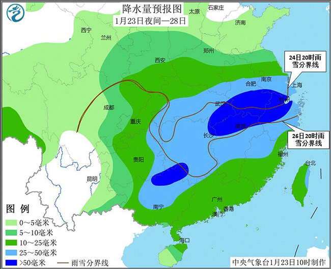 預(yù)計(jì),直至28日,西北地區(qū)東部、黃淮西部和南部、江淮、江漢、江南北部等地先后有中到大雪或雨夾雪,其中陜西東南部、河南南部、湖北大部、安徽、江蘇南部、浙江西北部等地的部分地區(qū)有暴雪,局地大暴雪;貴州、湖南、湖北等地部分地區(qū)有凍雨。其中,降雪集中時(shí)段在1月24日-25日、27日。