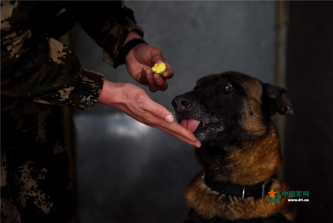 1月27日,武警安徽總隊(duì)機(jī)動(dòng)支隊(duì)警犬班班長王營廣在給警犬“魯克”喂食煮雞蛋。