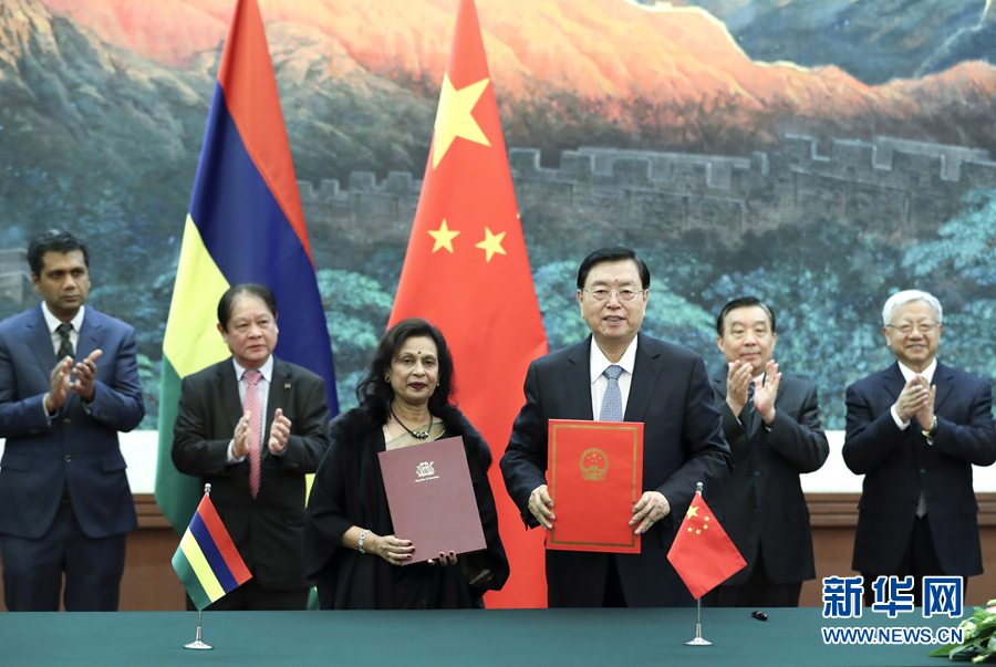 2月2日,全國人大常委會委員長張德江在北京人民大會堂與毛里求斯國民議會議長哈努曼吉舉行會談。這是雙方會談前共同出席中國全國人大與毛里求斯國民議會合作諒解備忘錄的簽字儀式。新華社記者 龐興雷 攝