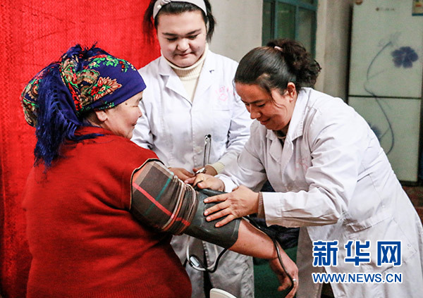 新疆喀什市浩罕鄉(xiāng)庫(kù)恰比西村衛(wèi)生所醫(yī)務(wù)人員在為村民測(cè)量血壓(2017年12月19日攝)。新華社記者 郝玉 攝