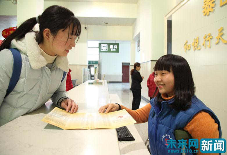 由于李厚萱行動(dòng)不便,志愿服務(wù)期間她的母親田秀云全程陪同。李厚萱在咨詢臺(tái)工作的時(shí)候,閑下來(lái)的田秀云便幫忙整理、分發(fā)列車時(shí)刻表,是泰山火車站“特殊”春運(yùn)志愿者。