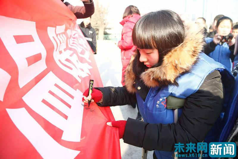 李厚萱拄著雙拐,在泰山火車站“暖冬行動(dòng)”的承諾條幅上簽字。(受訪者供圖)