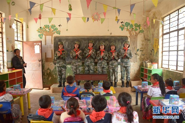 第75集團軍某特戰(zhàn)旅指揮通信連大學(xué)生女兵到駐地甸沙鄉(xiāng)草海子小學(xué)支教(2017年6月1日攝)。新華社發(fā)(張正舉 攝)