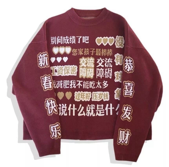 所謂鎧甲,其實(shí)是一件自帶吐槽氣質(zhì)的衛(wèi)衣,兩條袖子上分別印著“新春快樂”“恭喜發(fā)財(cái)”,仿佛大門兩側(cè)貼著喜慶的春聯(lián)。然而“推門”進(jìn)去,衛(wèi)衣正面沖出一大片冷冰冰的“彈幕”:“別問成績了吧”“工資保密”“交流障礙”“沒有對(duì)象”“您家孩子最棒棒”……