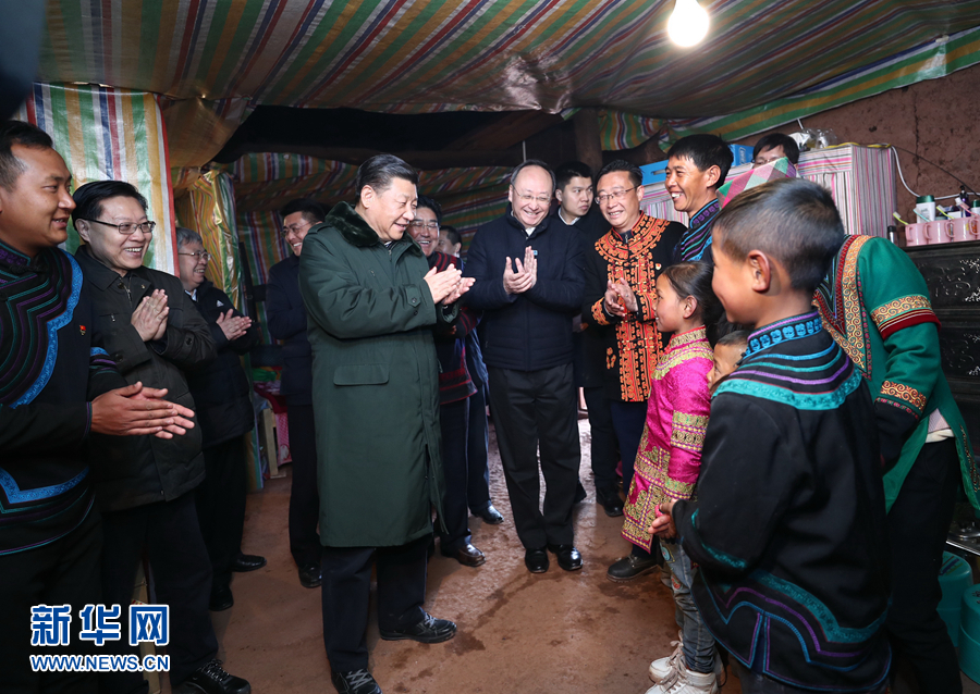 這是2月11日上午,習(xí)近平在涼山彝族自治州昭覺縣三岔河鄉(xiāng)三河村貧困戶吉好也求家中看望,聽10歲小女孩吉好有果唱《國旗國旗真美麗》。新華社記者 鞠鵬 攝