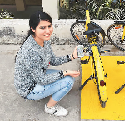 1月23日,在印度首都新德里一所學(xué)校,一名女生準(zhǔn)備掃碼使用ofo“小黃車”。新華社記者 張迺杰 攝