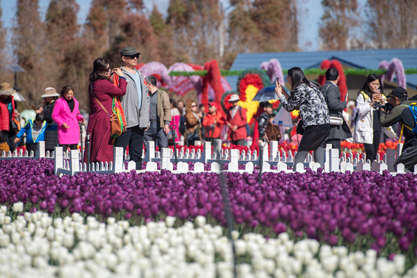 游客在云南省昆明市撈魚河濕地公園郁金香花海中拍照(2月17日攝)。新華社記者 胡超 攝