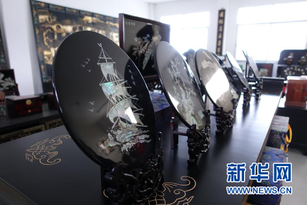 徽漆展廳里陳列的徽漆貝殼畫作品。新華網(wǎng) 卓越 攝