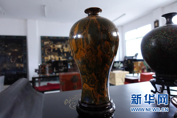 “流淌漆”技藝制作的花瓶。“流淌漆”即通過變換液態(tài)漆的濕度及流下的角度,使之形成自然的漆面花紋。新華網(wǎng) 卓越 攝