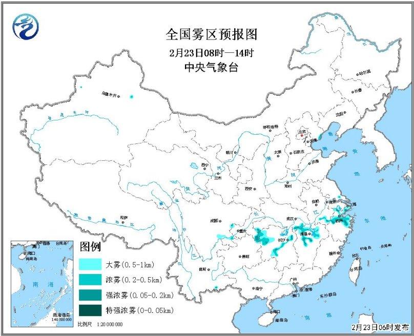 全國(guó)霧區(qū)預(yù)報(bào)圖(2月23日08時(shí)-14時(shí))