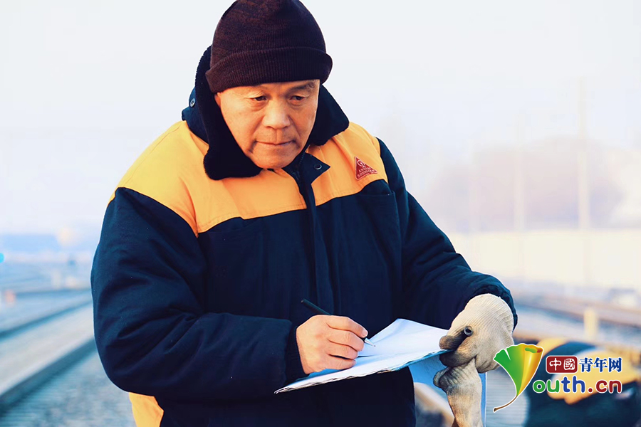 邰芳鵬正在記錄信號(hào)設(shè)備測試信息。春運(yùn)一開始,他便和工友們利用天窗時(shí)間,開展信號(hào)設(shè)備檢查、巡視、養(yǎng)護(hù)工作。中國青年網(wǎng)通訊員 姚旭東 攝