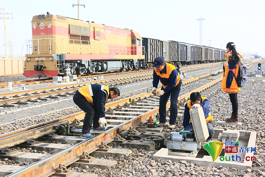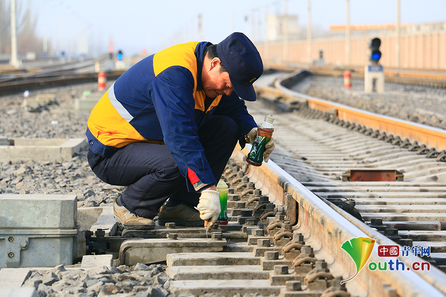 農(nóng)歷正月初八這天,邰芳鵬和工區(qū)3名年輕職工一同到現(xiàn)場,對(duì)阿克蘇站信號(hào)機(jī)和道岔進(jìn)行巡視檢查。中國青年網(wǎng)通訊員 姚旭東 攝