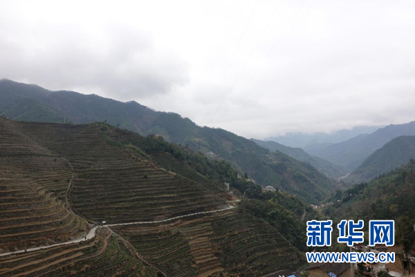 黃山市歙縣璜田鄉(xiāng)蜈蚣嶺村外蜿蜒的盤山公路與梯田。新華網(wǎng) 卓越 攝