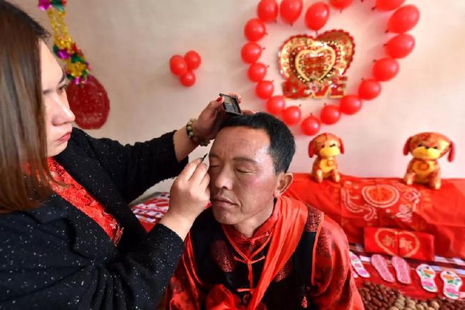 2月23日,在山西省永和縣奇奇里村,一位村民在幫新郎馮文忠化妝。新華社記者 曹陽 攝