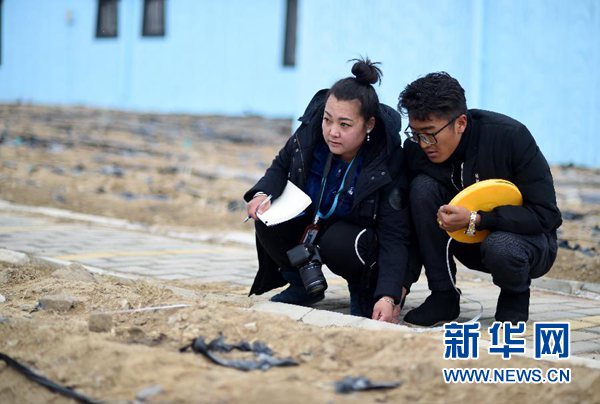 索朗央吉(左)與村干部測量房前屋后的地,準(zhǔn)備種植玫瑰、牧草等(3月6日攝)。新華社記者 覺果 攝