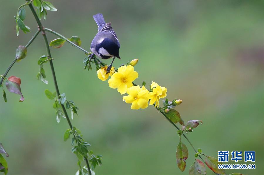 3月14日,在湖南省衡陽(yáng)市生態(tài)公園,一只小鳥(niǎo)停留在花枝上。新華社發(fā)(曹正平 攝)