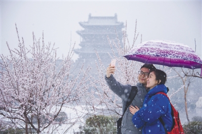 陰晴雨雪關(guān)系百姓生活,因此廣受關(guān)注。圖為日前山西省晉中市平遙縣迎來(lái)降雪天氣,游客在古城門(mén)外合影留念。梁生仁攝(新華社發(fā))