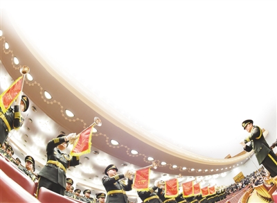 解放軍軍樂團此次演奏宣誓儀式曲和主席出場號角時,在形式上做出了特別安排——通常只用在室外舉行的國家典禮上的禮號,首次走進了人民大會堂。八面號旗掛在微微上揚的號管上,給人以耳目一新的感覺,儀式感更強,烘托典禮的隆重。