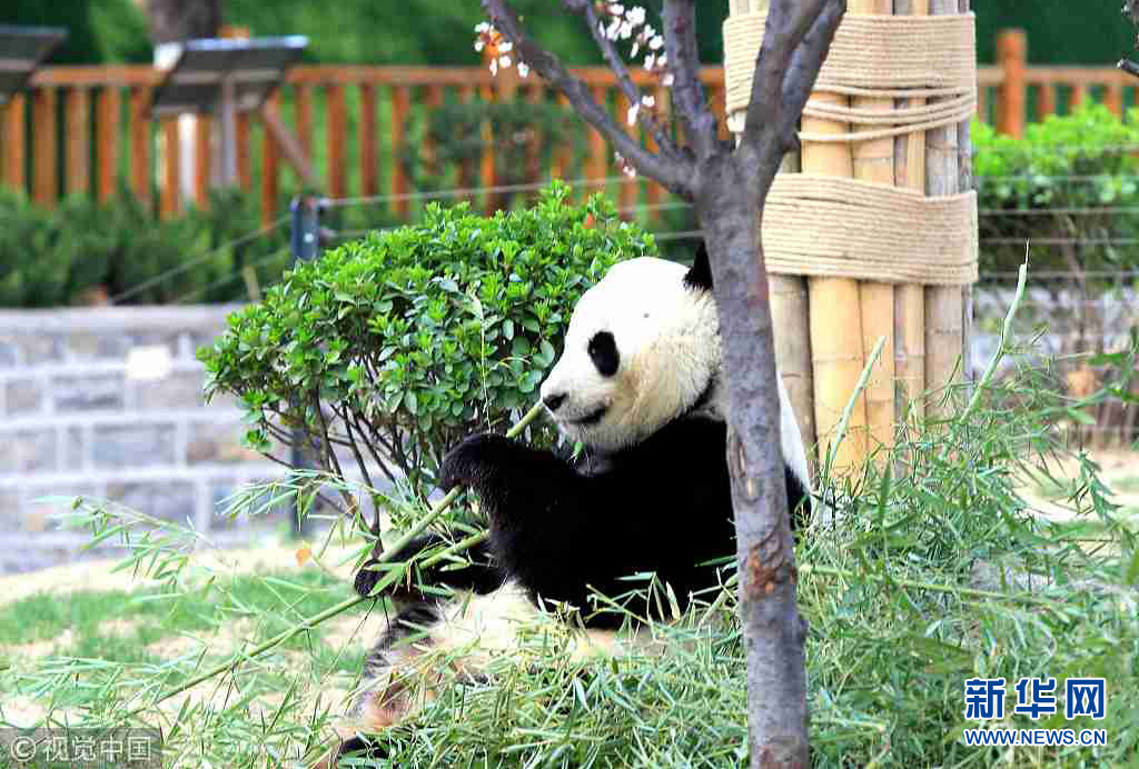 3月27日,山東濟南春暖花開,動物園內熊貓在園中散步吃美食享受春天美好陽光。(圖片來源:視覺中國)