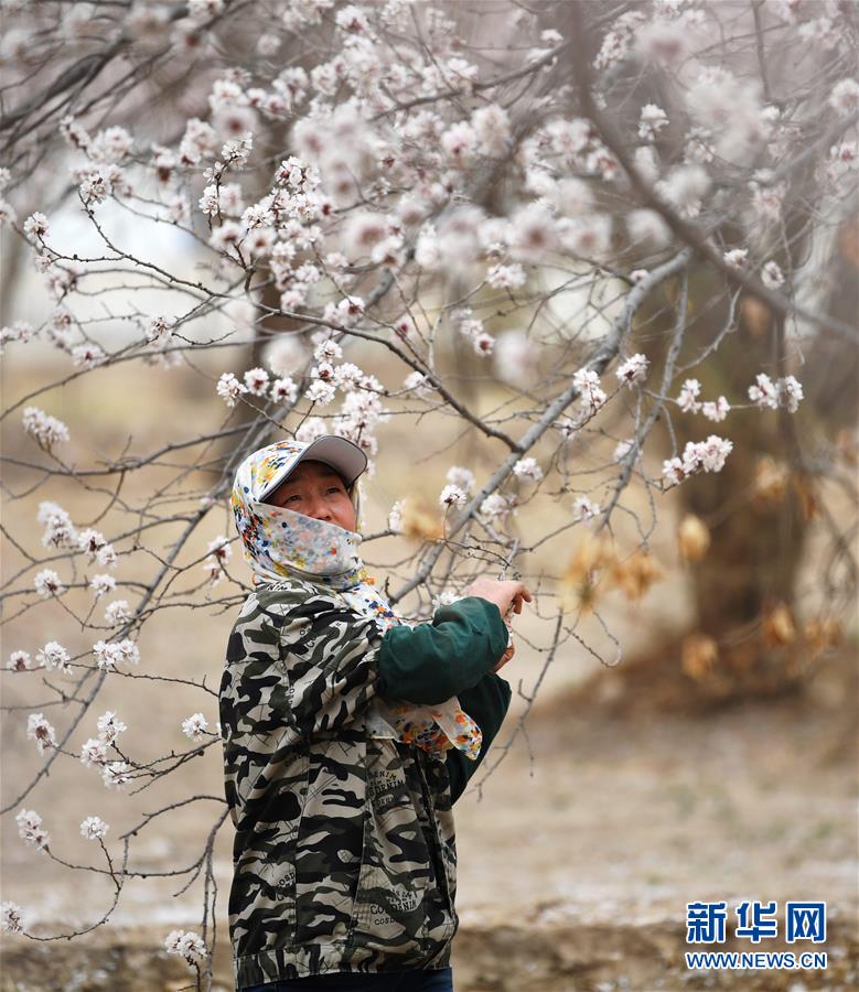 3月28日,農(nóng)民在敦煌鳴沙山下的李廣杏園內(nèi)勞作。近日,甘肅省敦煌市鳴沙山下8000多畝李廣杏花競相開放,吸引了眾多游客和市民踏青賞花。 新華社記者陳斌攝