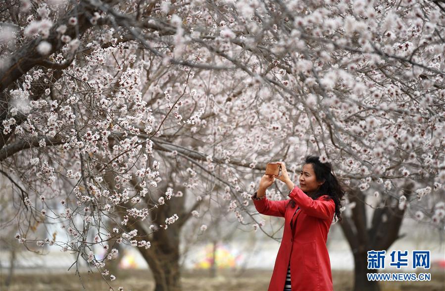 3月28日,游客在敦煌鳴沙山下的李廣杏園內(nèi)賞花拍照。近日,甘肅省敦煌市鳴沙山下8000多畝李廣杏花競相開放,吸引了眾多游客和市民踏青賞花。 新華社記者陳斌攝