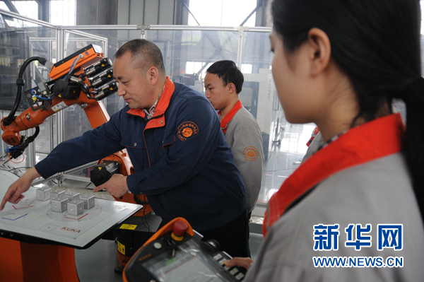 胡明華在機器人應(yīng)用工程實驗室里指導(dǎo)學生們進行機器人操作學習。新華網(wǎng) 聶晨靜 攝