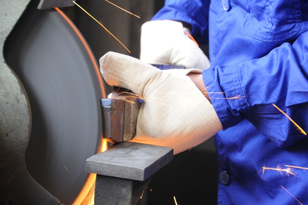 龍小平為記者現(xiàn)場演示車工最基礎(chǔ)的一道工序——磨刀。新華網(wǎng) 聶晨靜 攝