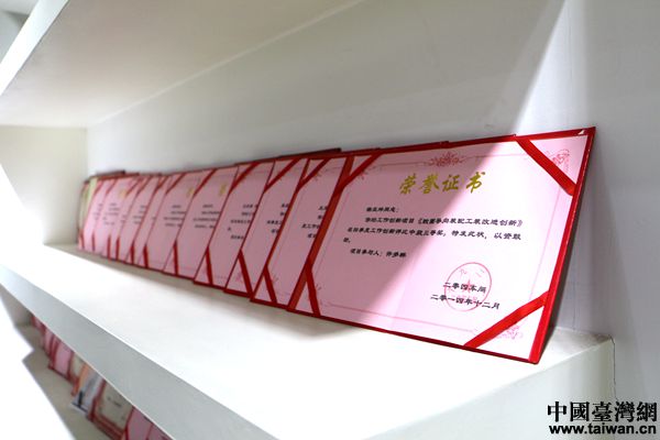 “楊尹渝班組”獲得的榮譽(yù)證書擺滿墻壁,這只是其中的一小部分。(中國(guó)臺(tái)灣網(wǎng) 盧佳靜 攝)